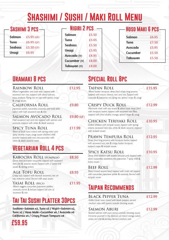 The menu at Taipan Asia offers a delightful selection of sushi and rolls, catering to a variety of tastes. For those looking for classic options, the Uramaki 8 Pcs range includes popular choices such as the Rainbow Roll, California Roll, Salmon Avocado Roll, and Spicy Tuna Roll. Vegetarians can enjoy the Vegetarian Roll 4 Pcs, with the Kabocha Roll, Age Tofu Roll, and Yasai Roll providing delicious plant-based options. For something more indulgent, the Special Roll 8 Pcs features exciting combinations like the Taipan Roll, Crispy Duck Roll, Chicken Teriyaki Roll, Prawn Tempura Roll, and Spicy Katsu Roll. To top it off, Taipan Recommends the delectable Black Pepper Tuna and Salmon Aburi, offering a unique, flavorful experience. Whether you're a sushi connoisseur or a newcomer, the menu offers a well-rounded selection that is sure to satisfy.